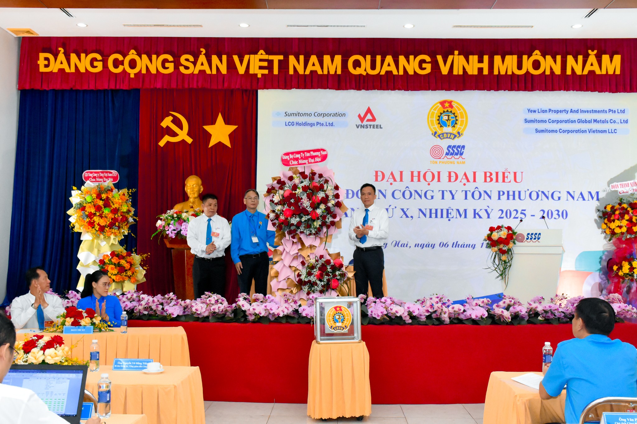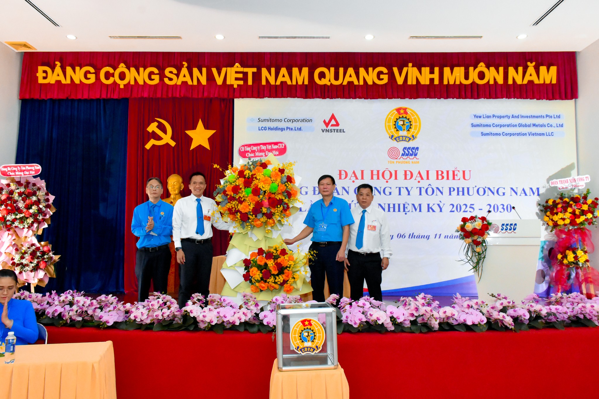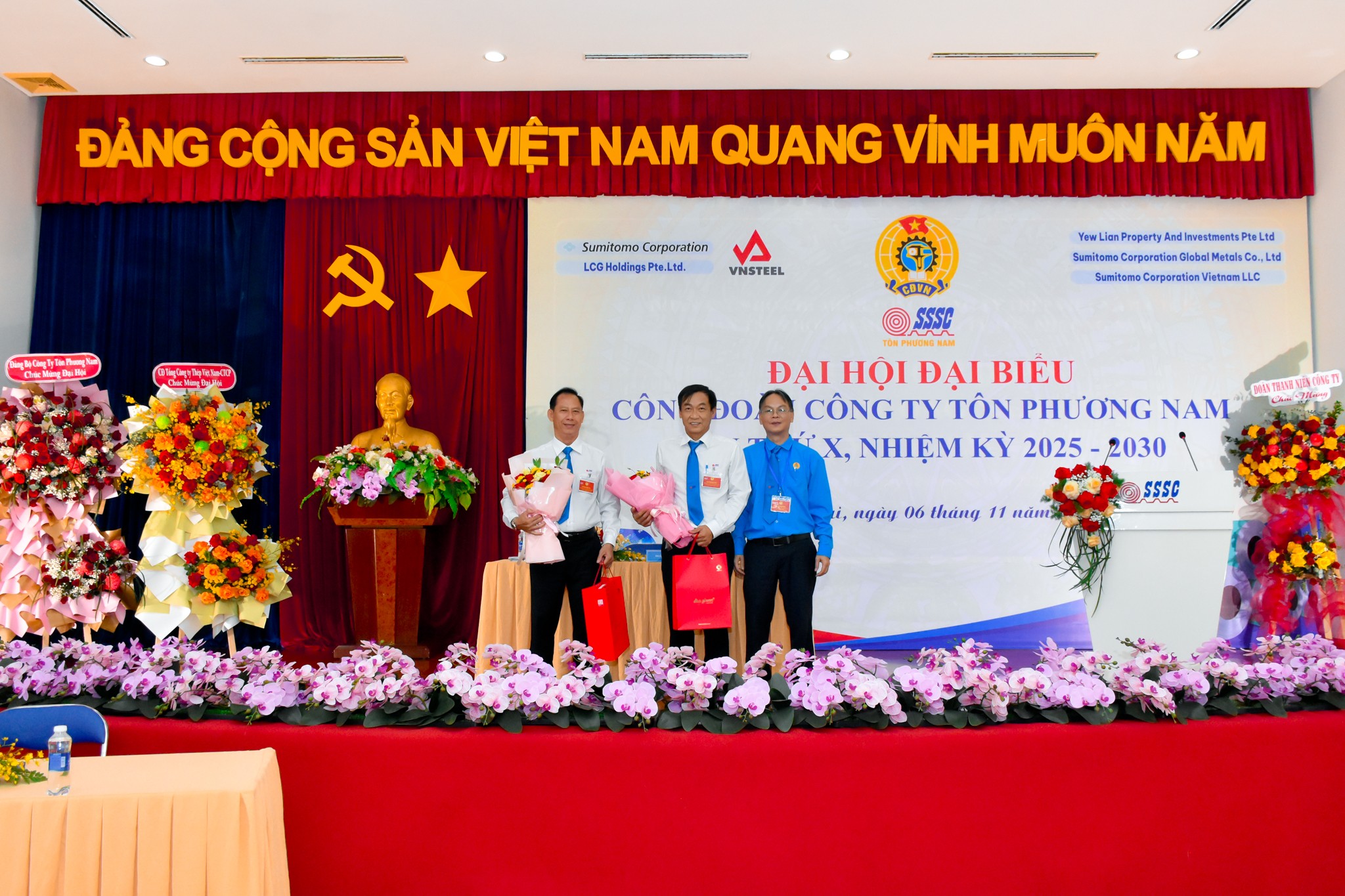 Đc Đồ Đình Trường - Phó Chủ tịch Công đoàn Tổng Công ty Thép Việt Nam, đ/c Nguyễn Võ Hồng Tiền - Bí thư Đảng uỷ, Tổng Giám đốc Công ty và Ông Koji Ikematsu - Phó Tổng giám đốc Cty tặng hoa chúc mừng BCH khoá X, NK 2025 - 2030