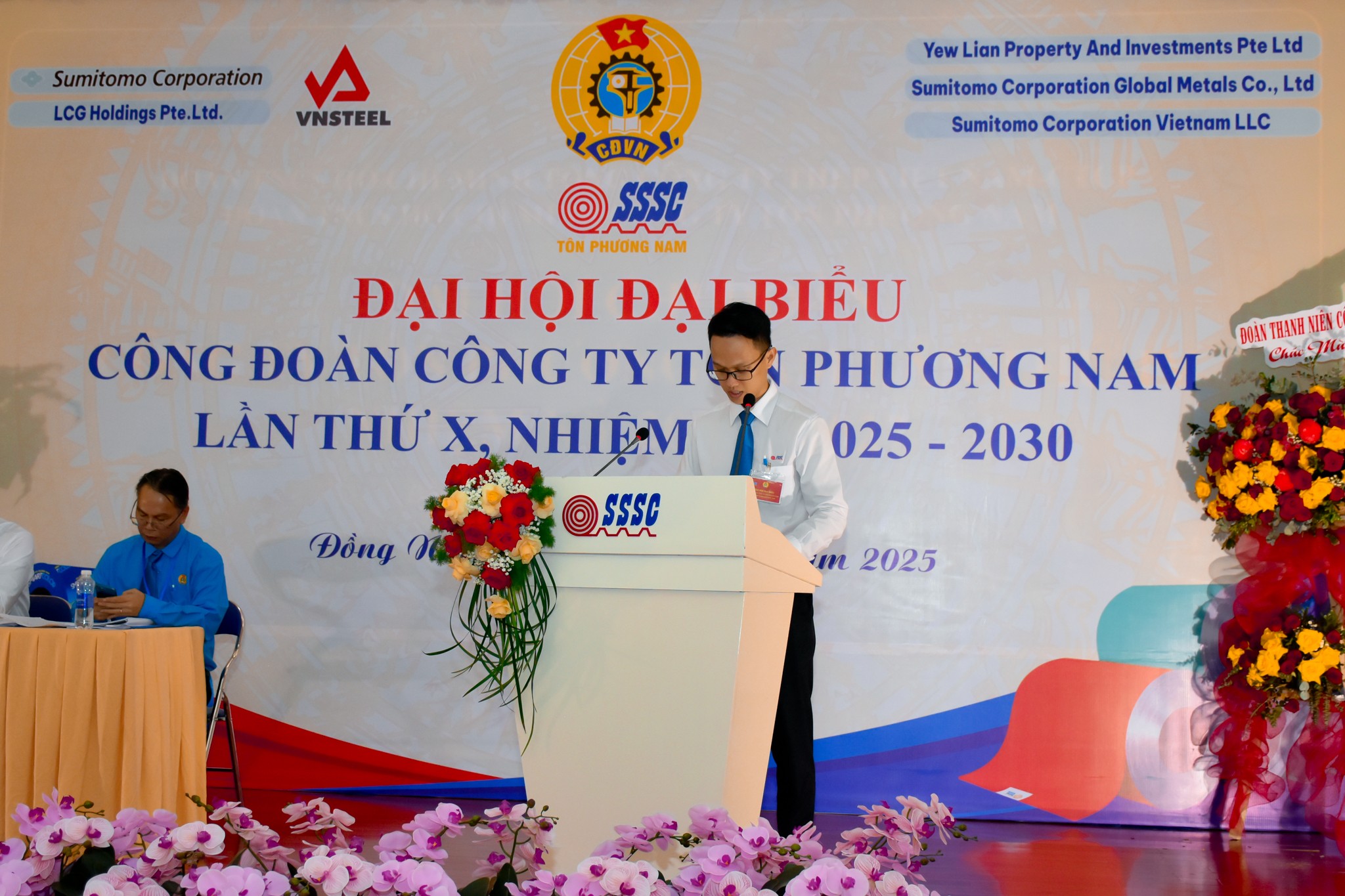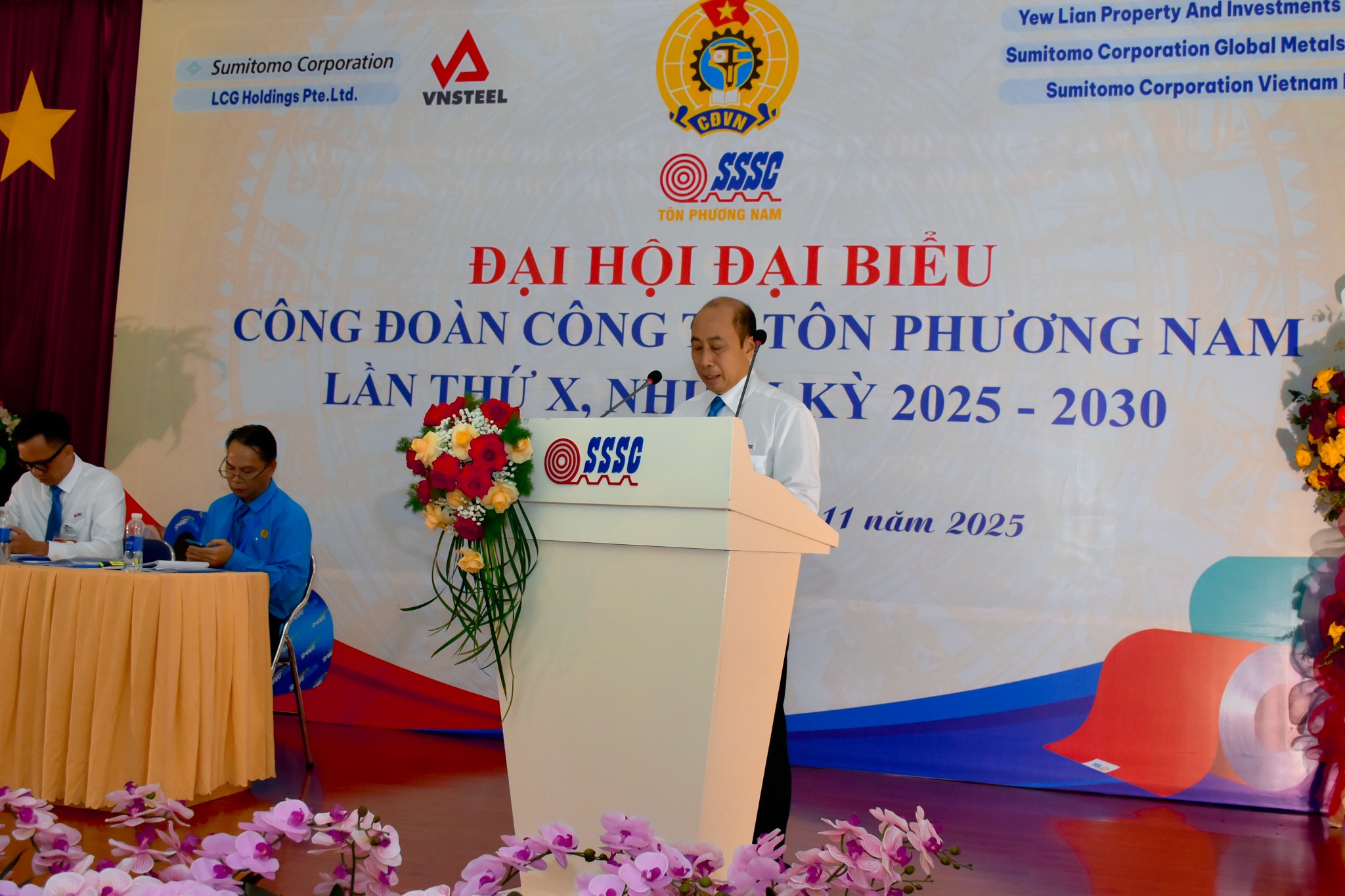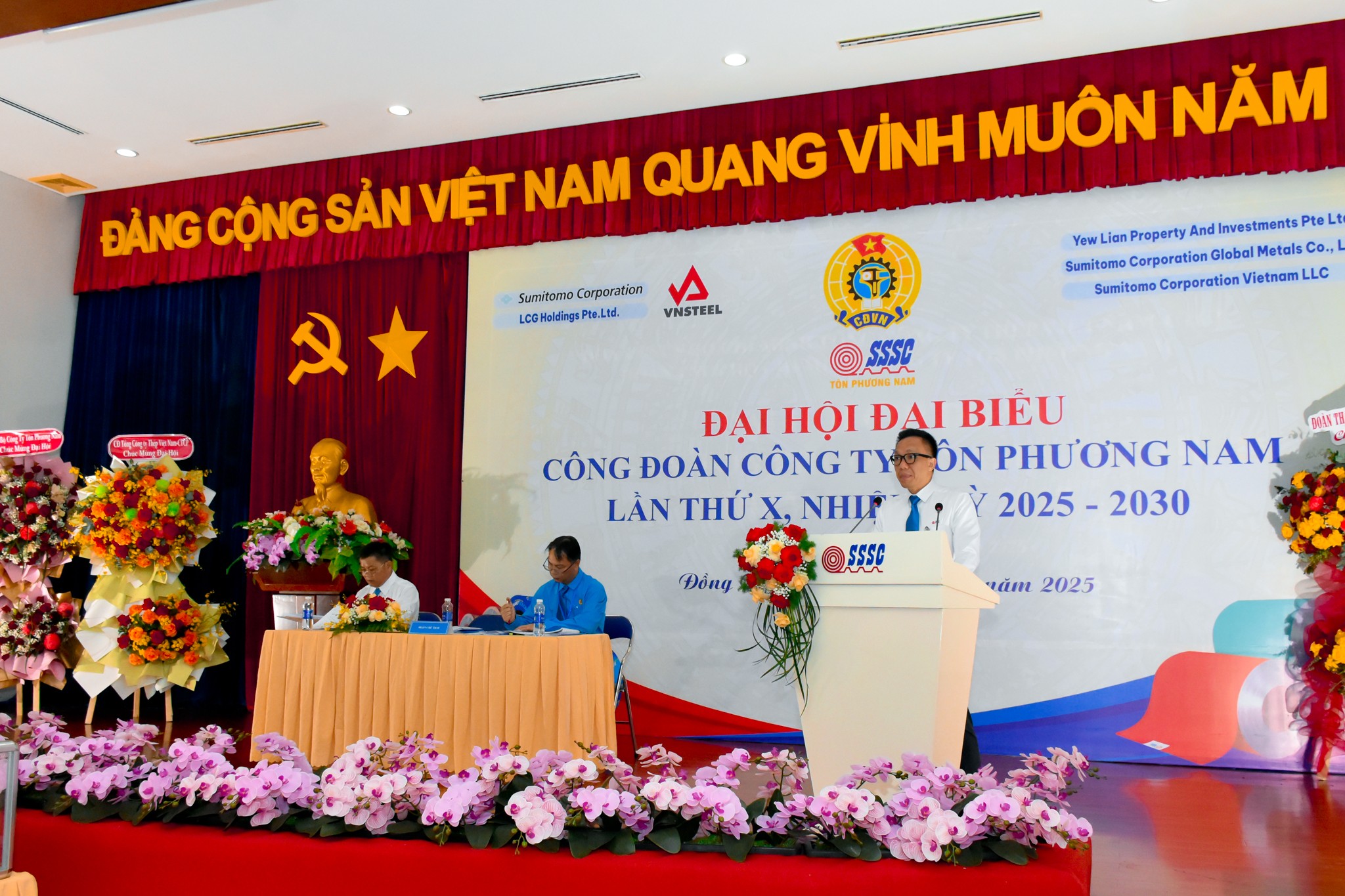 Đc Đồ Đình Trường - Phó Chủ tịch Công đoàn Tổng Công ty Thép Việt Nam, đ/c Nguyễn Võ Hồng Tiền - Bí thư Đảng uỷ, Tổng Giám đốc Công ty và Ông Koji Ikematsu - Phó Tổng giám đốc Cty tặng hoa chúc mừng BCH khoá X, NK 2025 - 2030
